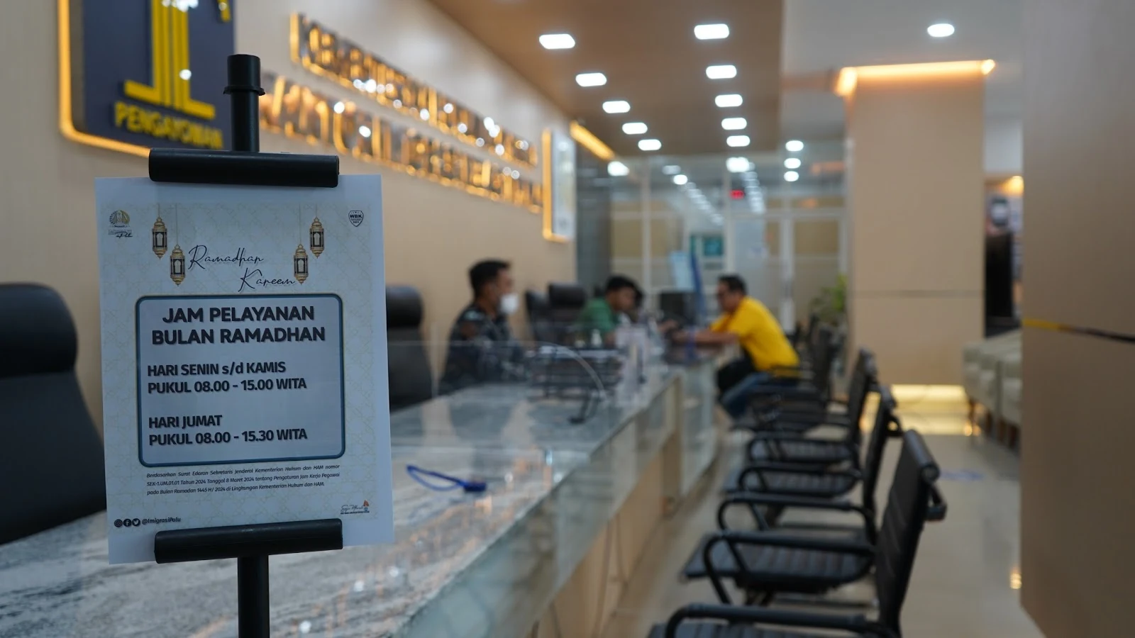 Menindaklanjuti isi surat edaran tersebut Kantor Imigrasi Kelas I TPI Palu sebagai salah satu Unit Pelaksana Teknis (UPT) di lingkungan Kementerian Hukum dan Hak Asasi Manusia melaksanakan pelayanan berupa pembuatan paspor dan layanan keimigrasian lainnya dimulai pada pukul 08.00 s/d 15.00 untuk hari senin - kamis dan pukul 08.00 s/d 15.30 untuk hari jumat. Kebijakan ini sesuai dengan jumlah jam kerja efektif selama bulan Ramadan 1445 H/2024 M agar memenuhi minimal 32,5 jam (tiga puluh dua jam dan tiga puluh menit) per minggu.
